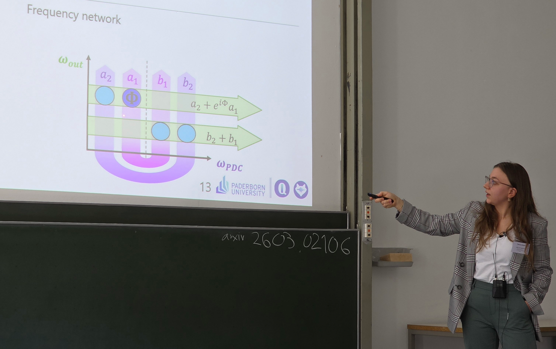 On Thursday (05.03.2026), Theresa Keuter presented her research results on "Non classicality in frequency multiplexed quantum networks". With a confident charisma and an easy-to-follow presentation style, she succeeded in conveying her expert knowledge on novel frequency-encoded quantum networks and their non-classical properties to a broad scientific audience in an understandable way.