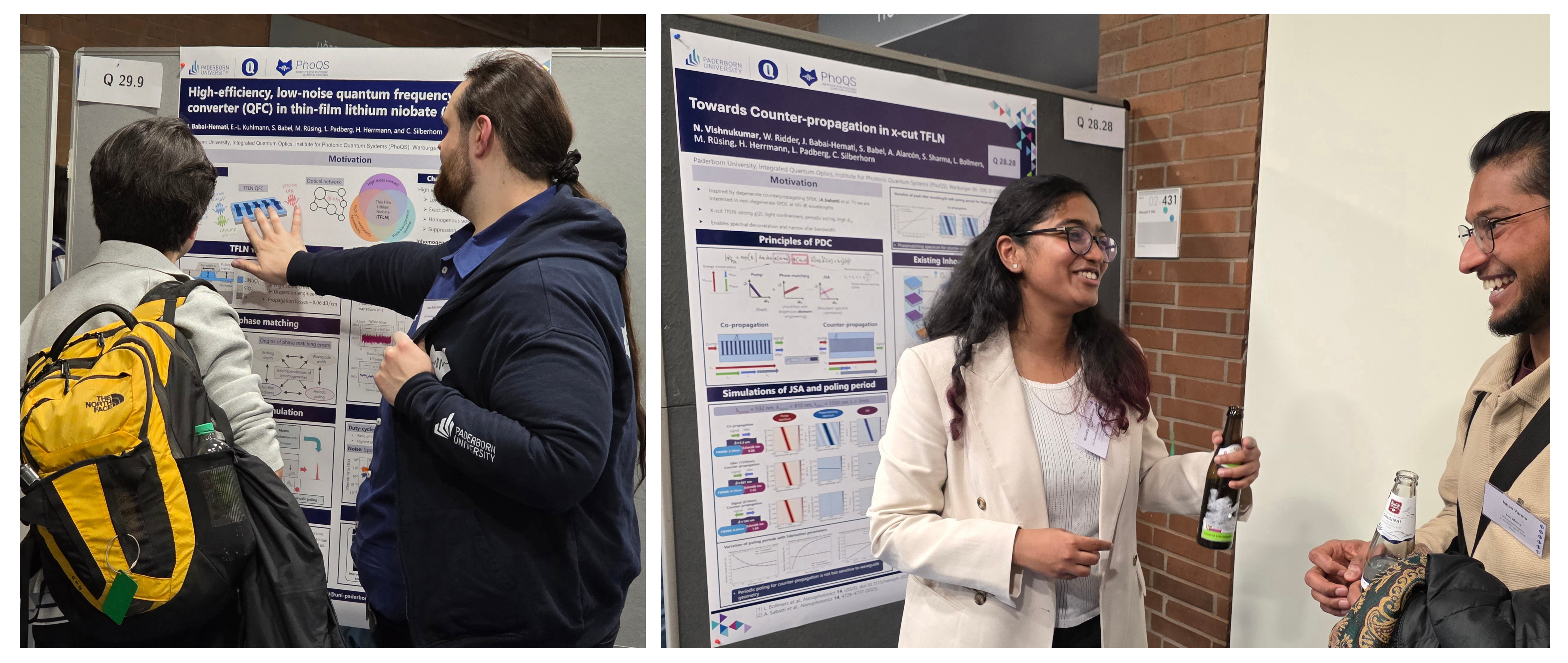 On Tuesday (03.03.2026), Nivedita Vishnukumar and Jonas Babai-Hemati presented their latest research results with their posters entitled "Towards counterpropagating frequency converters in x-cut TFLN" and "Towards low noise and high efficient quantum frequency converters in TFLN", respectively. The two young scientists shared their findings in the field of photon generation and frequency conversion on the thin-film lithium niobate platform (TFLN platform). New approaches and ideas were explored in numerous discussions.
