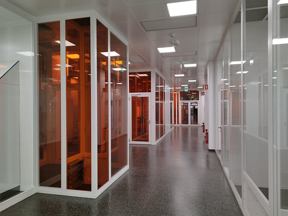 Zur Fabrikation von integriert-optischen Chips haben wir Zugang zu modernen Reinraumanlagen (ISO5/6) im Gebäude P10 (PhoQS-Lab). Die technische Ausstattung ermöglicht die Herstellung integriert-optischer Schaltkreise sowohl in Dünnschicht-Lithiumniobat, als auch in Lithiumniobat-Volumenkristallen. Hierbei kann auf verschiedene Lithographieverfahren, z.B. Maskenlithographie, Laserstrahllithografie oder Elektronenstrahl-Lithographie, auf nasschemische und trockene Ätzverfahren zur Wellenleiterherstellung, auf Beschichtungsverfahren, sowie auf umfangreiche Methoden zur Charakterisierung der hergestellten Chips zurückgegriffen werden.