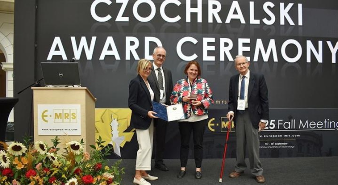 Am 15.-18. September 2025 fand das Fall Meeting 2025 der European Materials Research Society EMRS mit fast 1800 Tagungsbeiträgen und Teilnehmer:innenaus 52 Nationen an der University of Technology in Warschau unter der Leitung von Prof. Dr. Jörg Lindner, Dr. Rosaria Puglisi (Catania, Italien), Prof. Sang Ouk Kim (KAIST, Südkorea) und Prof. Dr. Andrzej Mycielski (Acad. of Science, Warsaw) statt. Es war das bislang größte Fall Meeting seit Beginn der Tagungsreihe in 2002 mit 23 parallel laufenden Symposia in den Bereichen "Materials for Energy, Sustainability and Extreme Conditions", "Characterization, Simulation and Artificial Intelligence", "Thin Film, Flexible and Composite Materials and their Formation Techniques"und "Electronic, Photonic, Nano, Low-dimensional and Quantum Materials". In der Plenarsitzung wurde die Jan Czochralski Medallie der EMRS an Prof. Dr. Claudia Felser, Vizepräsidentin der Max-Planck Gesellschaft, für ihre Verdienste auf dem Gebiet der Materialforschung verliehen. Das Foto zeigt (v.l.n.r.) Prof. Dr. Guiseppina Padeletti (EMRS President), Prof. Dr. Lindner (Laudator und Conf. Chairman) , Preisträgerin Prof. Dr. Claudia Felser (MPG München) und Prof. Dr. Andrzej Mycielski (Acad. of Science, Warsaw).