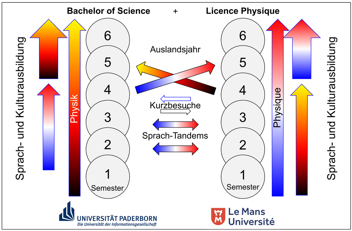 Bei der Variante Physik mit Französisch ist vorgesehen, dass die Studierenden während der ersten vier Semester begleitend zum Fachstudium vertiefte Sprachkenntnisse in Französisch erwerben (auf Englisch kann dann verzichtet werden) und dann das 5. und 6. Semester an der Le Mans Université weiterstudieren. Umgekehrt kommen Studierende aus Le Mans in ihrem 5. Und 6. Fachsemester an die Uni Paderborn.